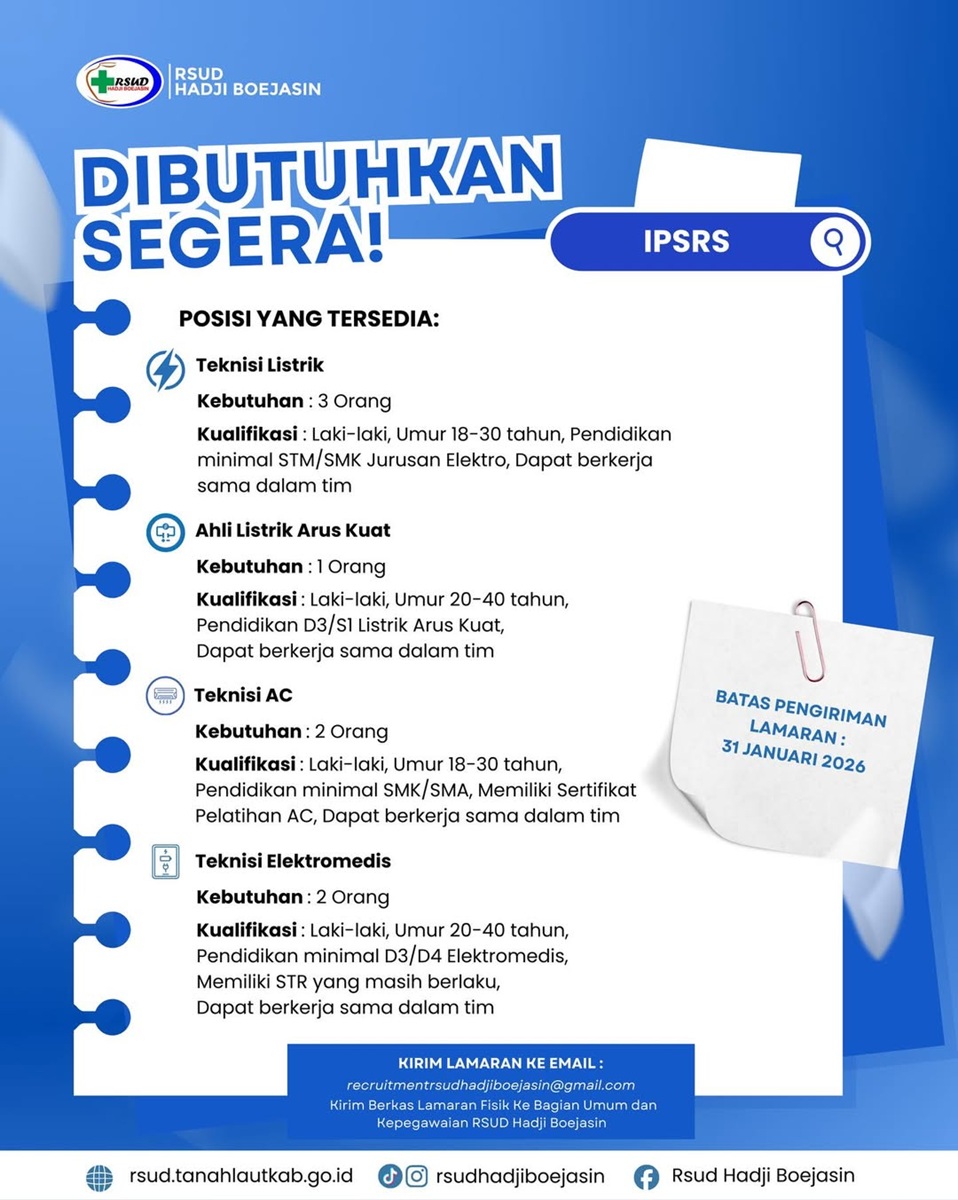 Ayobanua.com, Pelaihari – Rumah Sakit Umum Daerah (RSUD) Hadji Boejasin Pelaihari kembali memperkuat jajaran operasionalnya. Saat ini, rumah sakit plat merah tersebut membuka lowongan kerja untuk posisi tenaga Badan Layanan Umum Daerah (BLUD) Non-ASN guna mengisi pos Instalasi Pemeliharaan Sarana dan Prasarana Rumah Sakit (IPSRS).